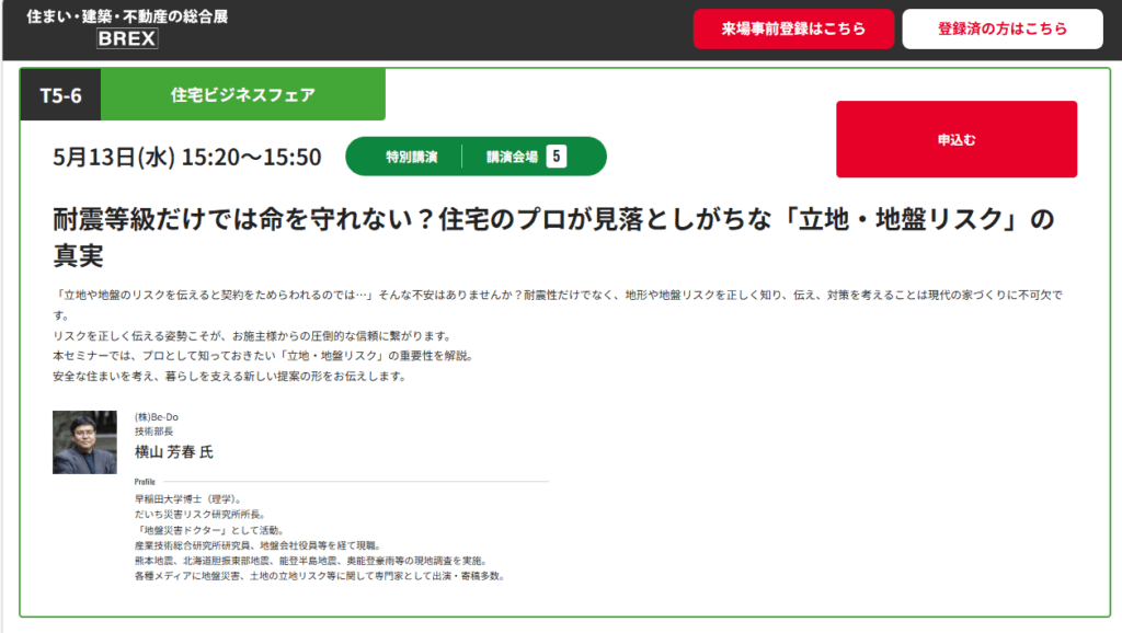 住宅ビジネスフェアの会期中に開催される特別講演にて、5月13日(水)15:20~15:50に当社技術部長の横山芳春が「耐震等級だけでは命を守れない?住宅のプロが見落としがちな「立地・地盤リスク」の真実」と題して講演をいたします。