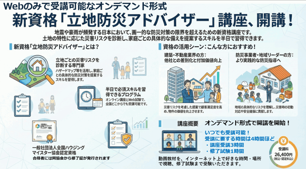 なお、「立地防災アドバイザー講座」は、一般社団法人全国ハウジングマイスター協会の認定講座として開講され、合格者には同協会より修了証が発行されます。