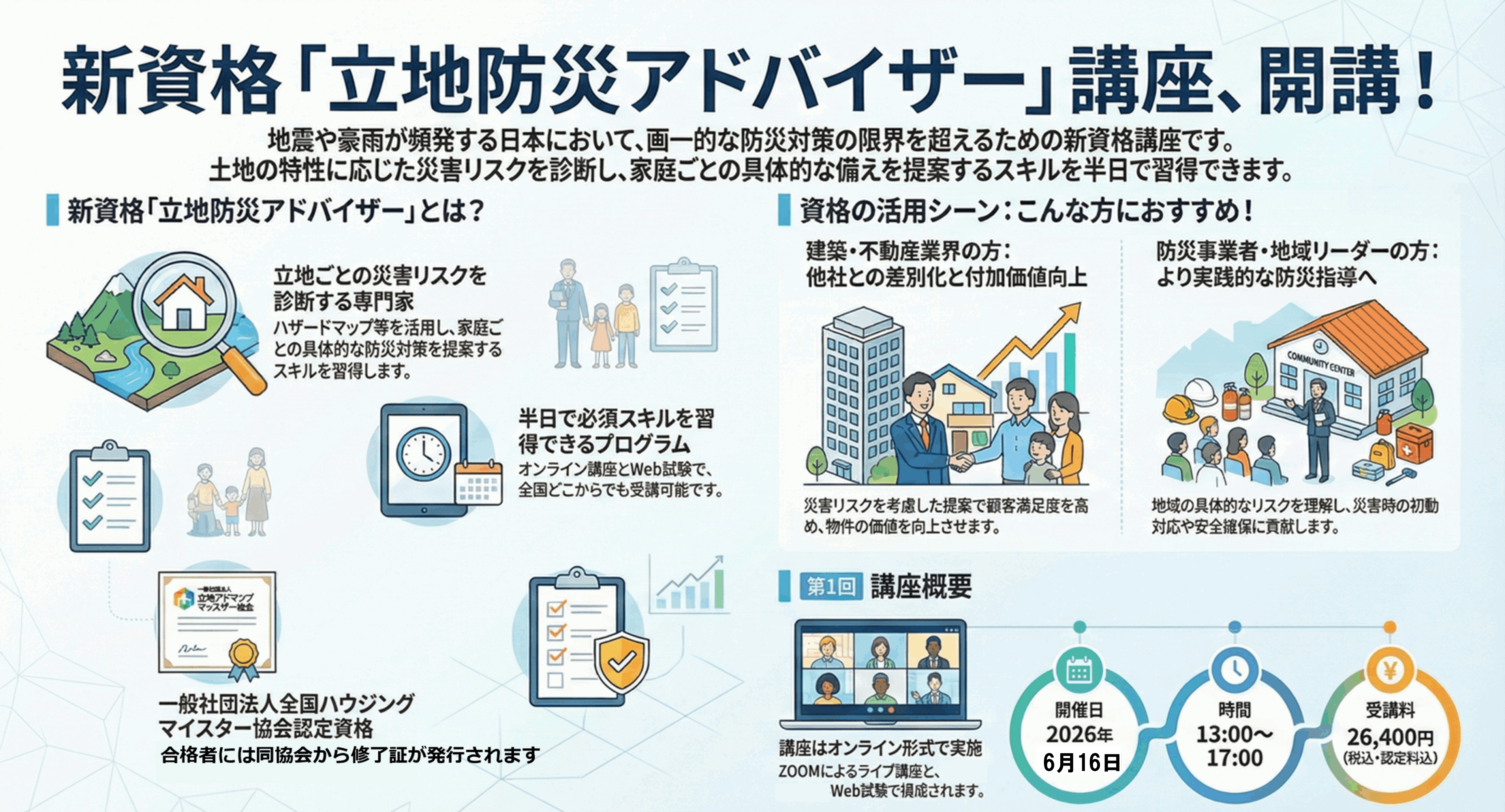 なお、「立地防災アドバイザー講座」は、一般社団法人全国ハウジングマイスター協会の認定講座として開講され、合格者には同協会より修了証が発行されます。