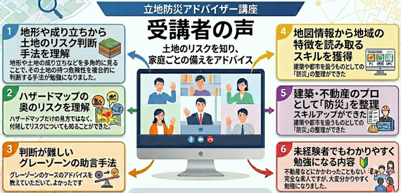 ※「立地防災アドバイザー講座」は建築基準法や宅建業法(重要事項説明等)等が求める内容とは別個に、自主的な立地の自然災害(地震、豪雨)リスクの診断および、それに基づいた家庭の防災の備えの提案等に活用できるスキルを学ぶ講座となりますので、予めご了承ください。