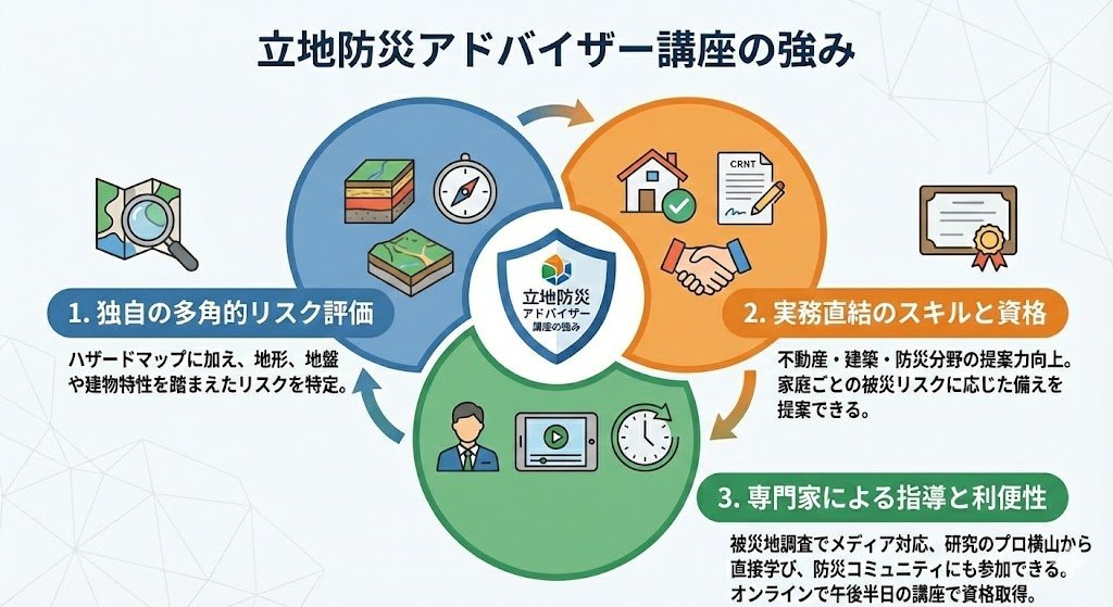 立地防災アドバイザー講座は、講座の受講だけではによる知識や技能習得だけではないメリットもあります。